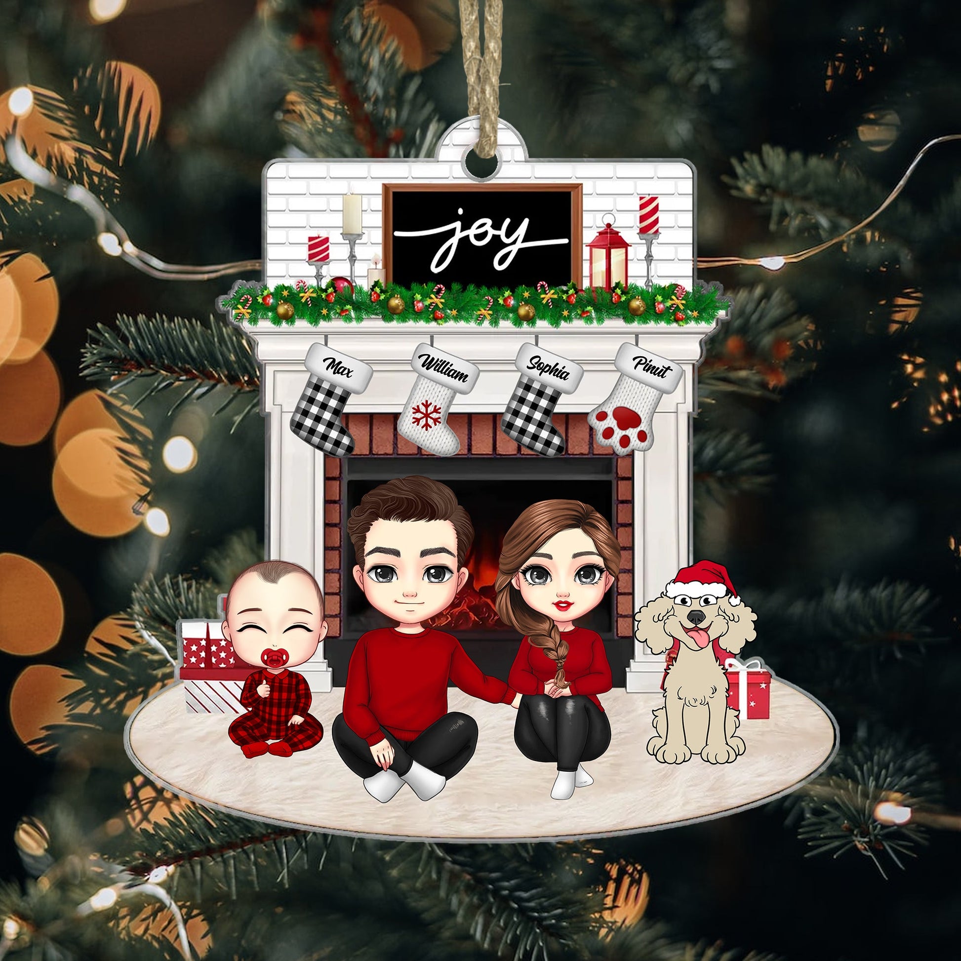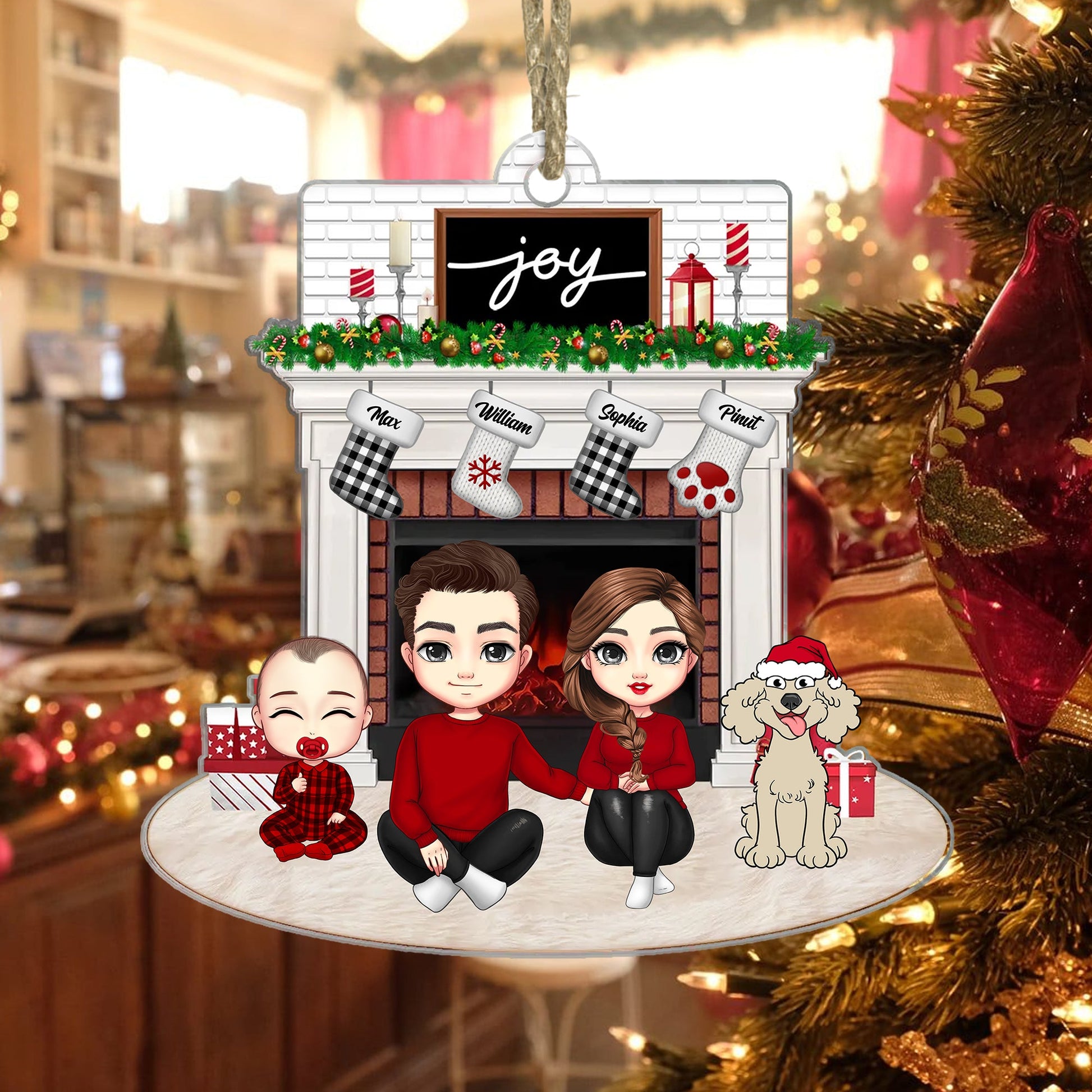 Joy Christmas Family By The Fireplace - Personalized Acrylic Ornament - Gift For Family, Xmas Gift